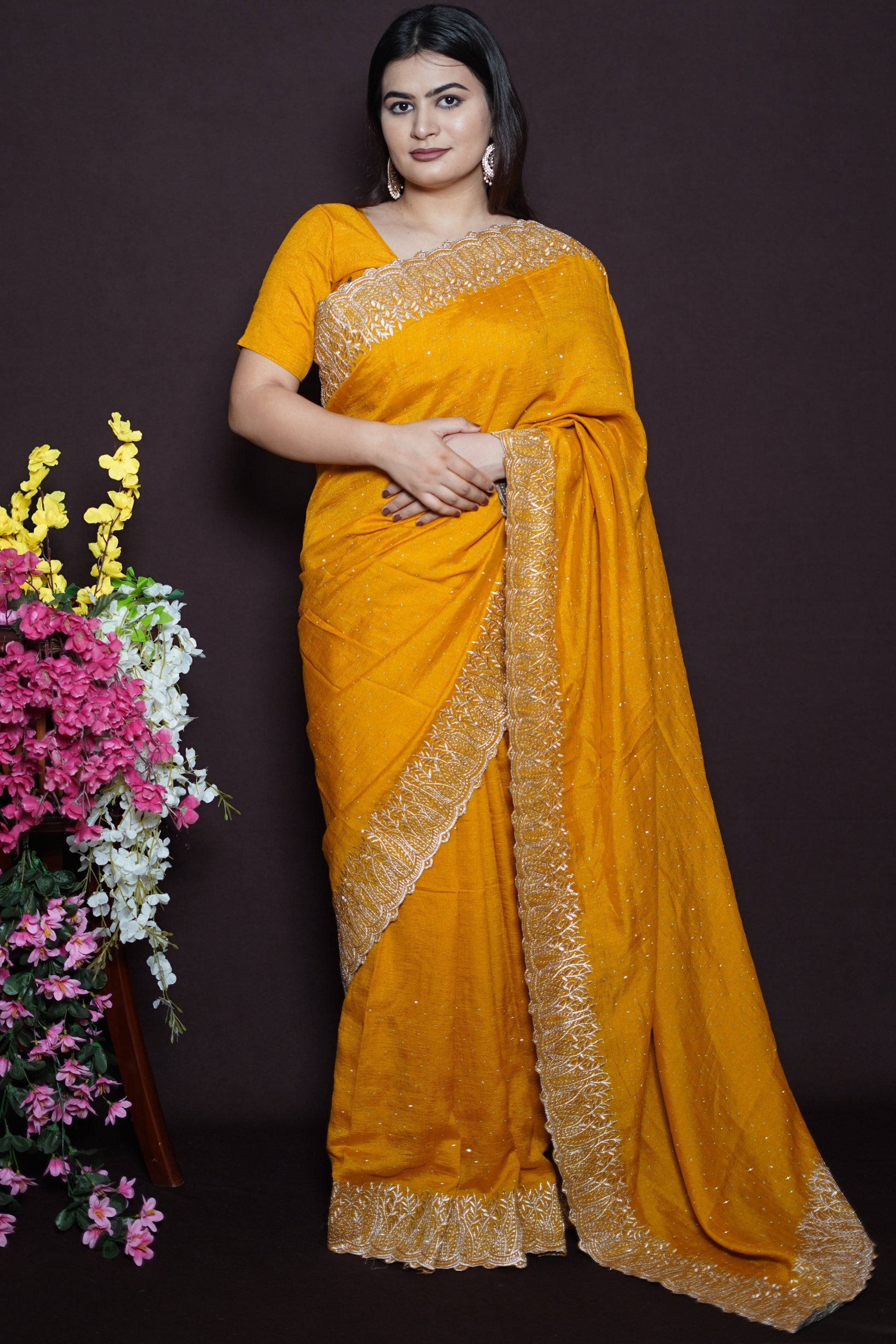Shine with elegance in this Mustard Yellow Georgette Saree, featuring rich golden embroidered lace border and delicate sequin work. Crafted from premium georgette fabric, this party wear saree from Unikloth offers effortless draping and radiant charm.