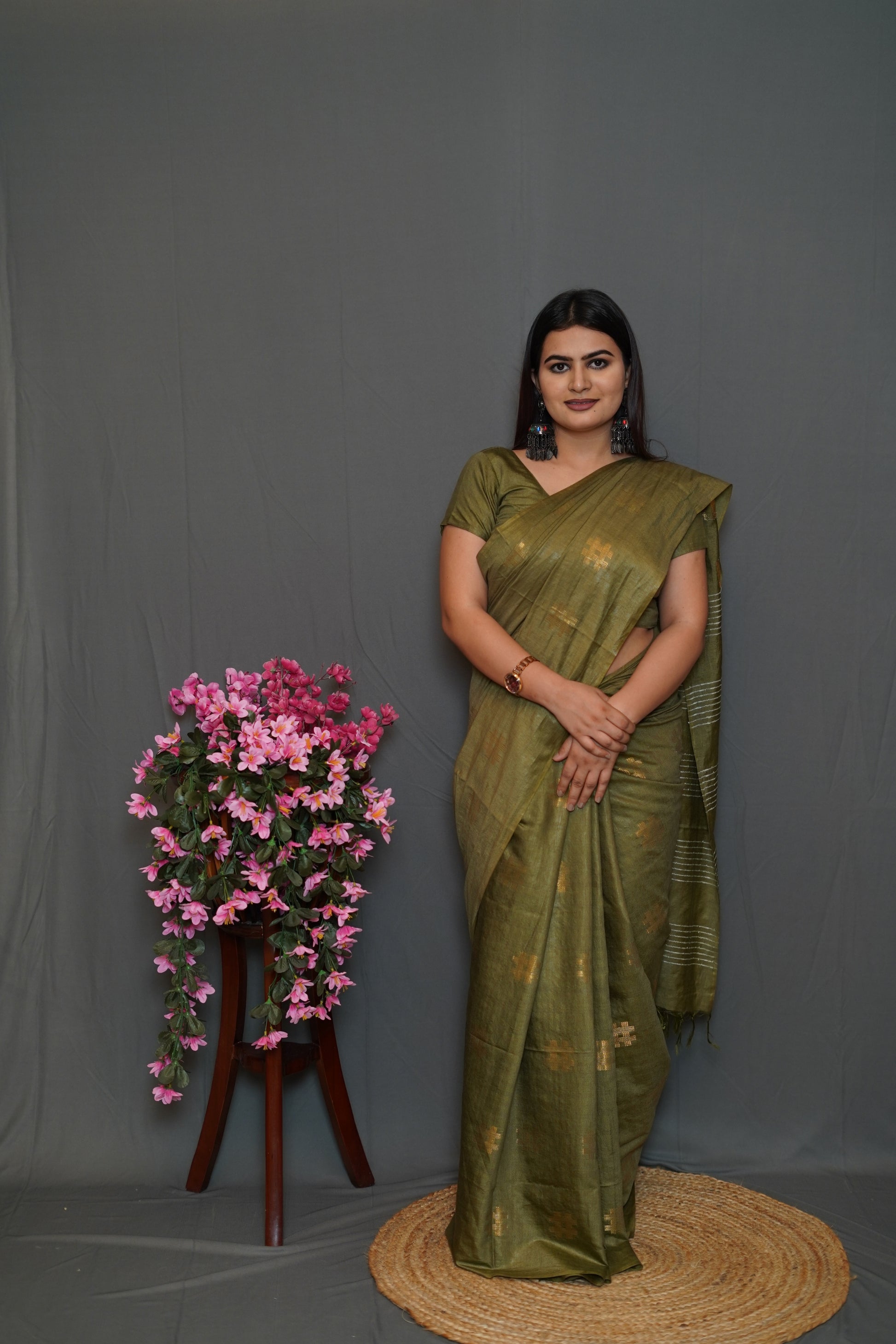 This Olive Green Cotton Saree radiates earthy elegance with its subtle golden thread motifs and striped woven pallu. Crafted from soft cotton, it offers a perfect blend of comfort and sophistication. Designed by Unikloth, this saree is ideal for women who appreciate minimal yet classy traditional wear that stands out with timeless charm.
