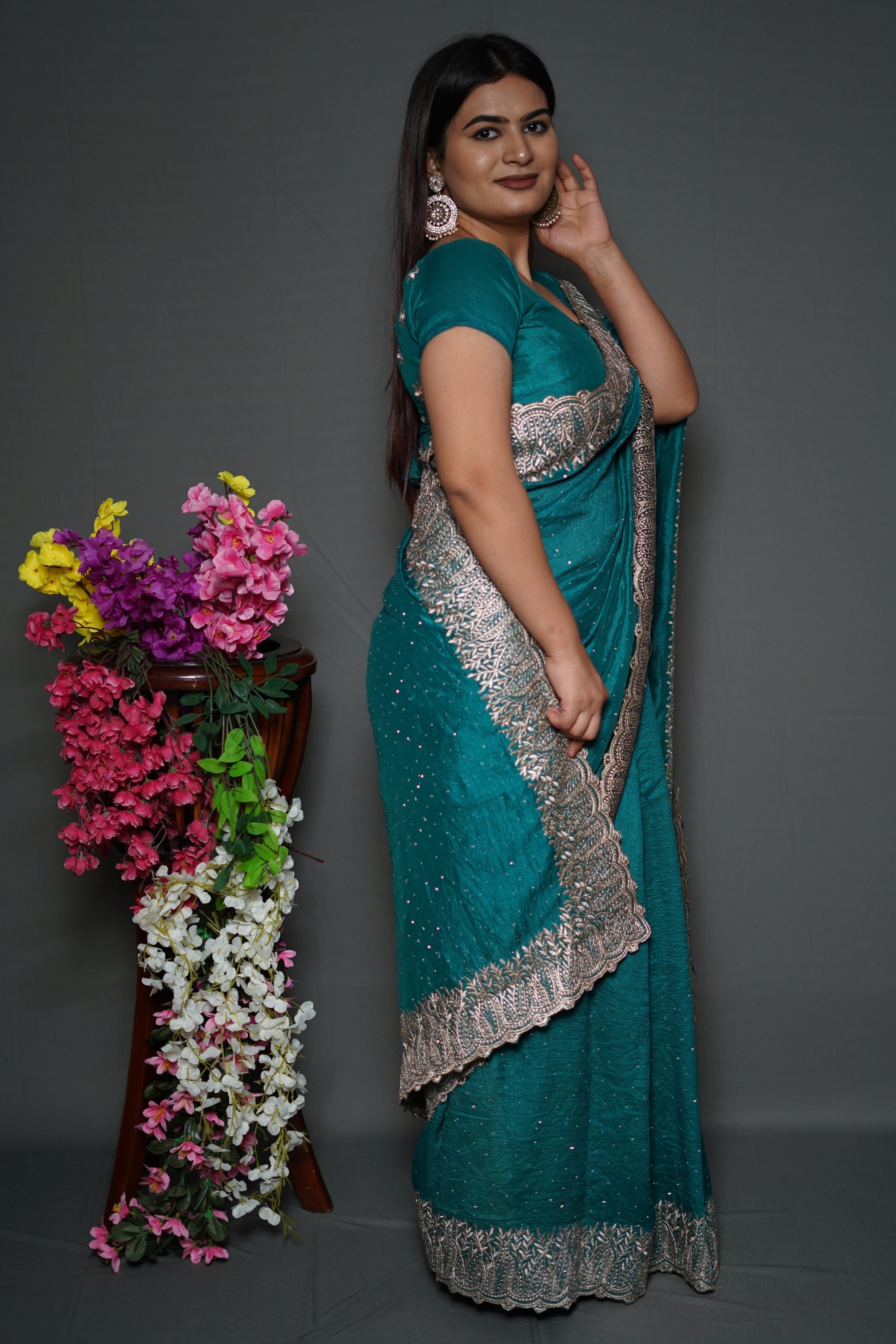 Radiate charm and sophistication with this teal blue georgette saree featuring exquisite silver embroidery and a delicately detailed lace border. The lightweight georgette fabric ensures effortless draping and comfort, making it a perfect pick for elegant evening events.