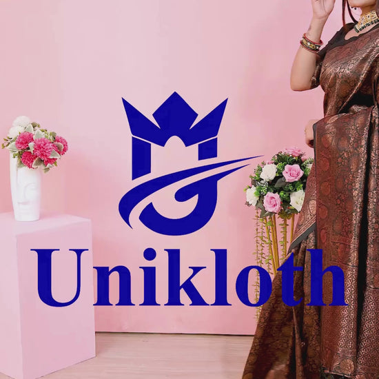 Stand out in this Dark Copper Brown Banarasi Silk Saree, featuring intricate zari weaving and a bold black border. Crafted from premium silk, it drapes beautifully, offering timeless elegance and a royal touch—ideal for women who love classic ethnic fashion.