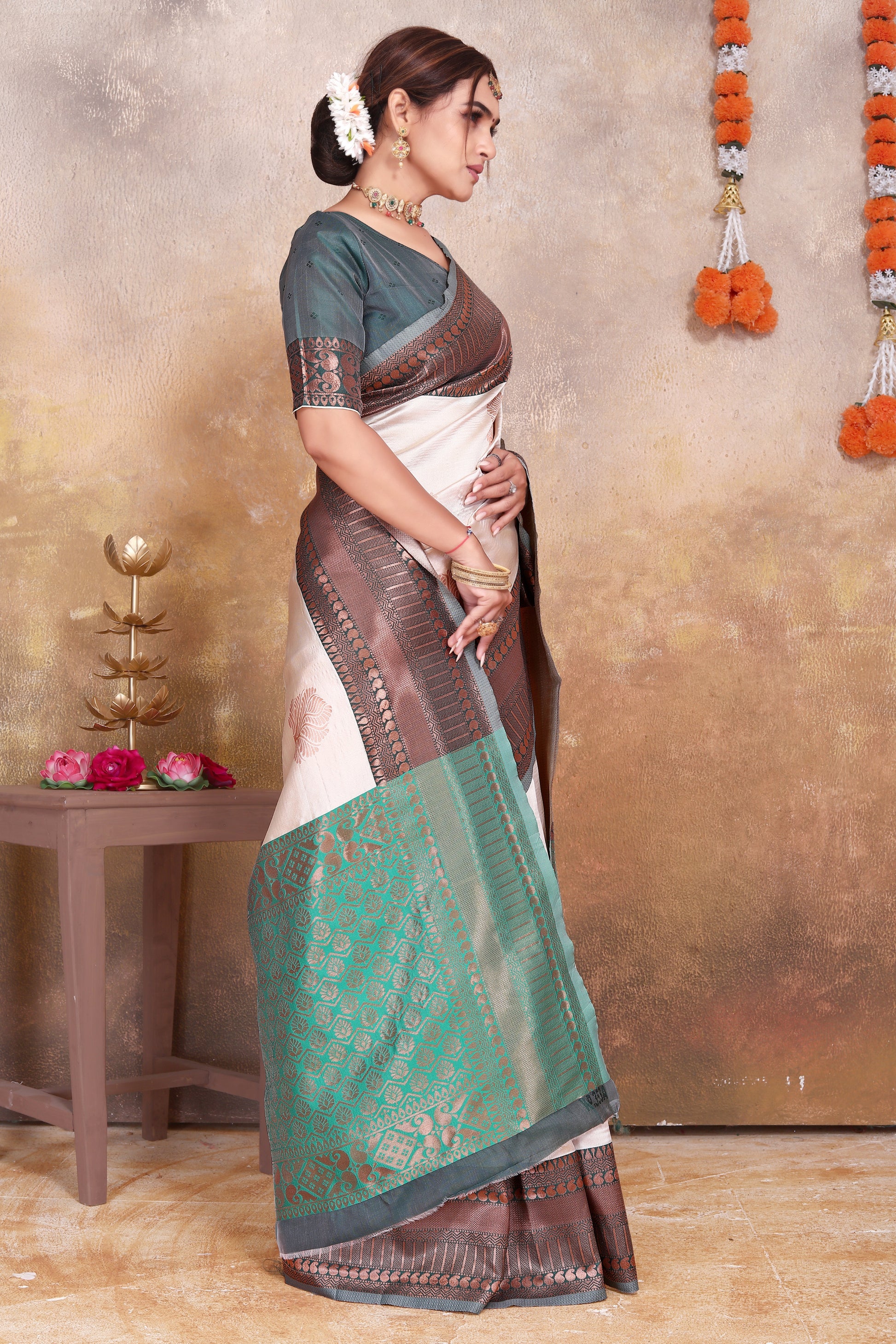 Cream Kanjivaram Silk Saree with Green & Brown Zari Border
