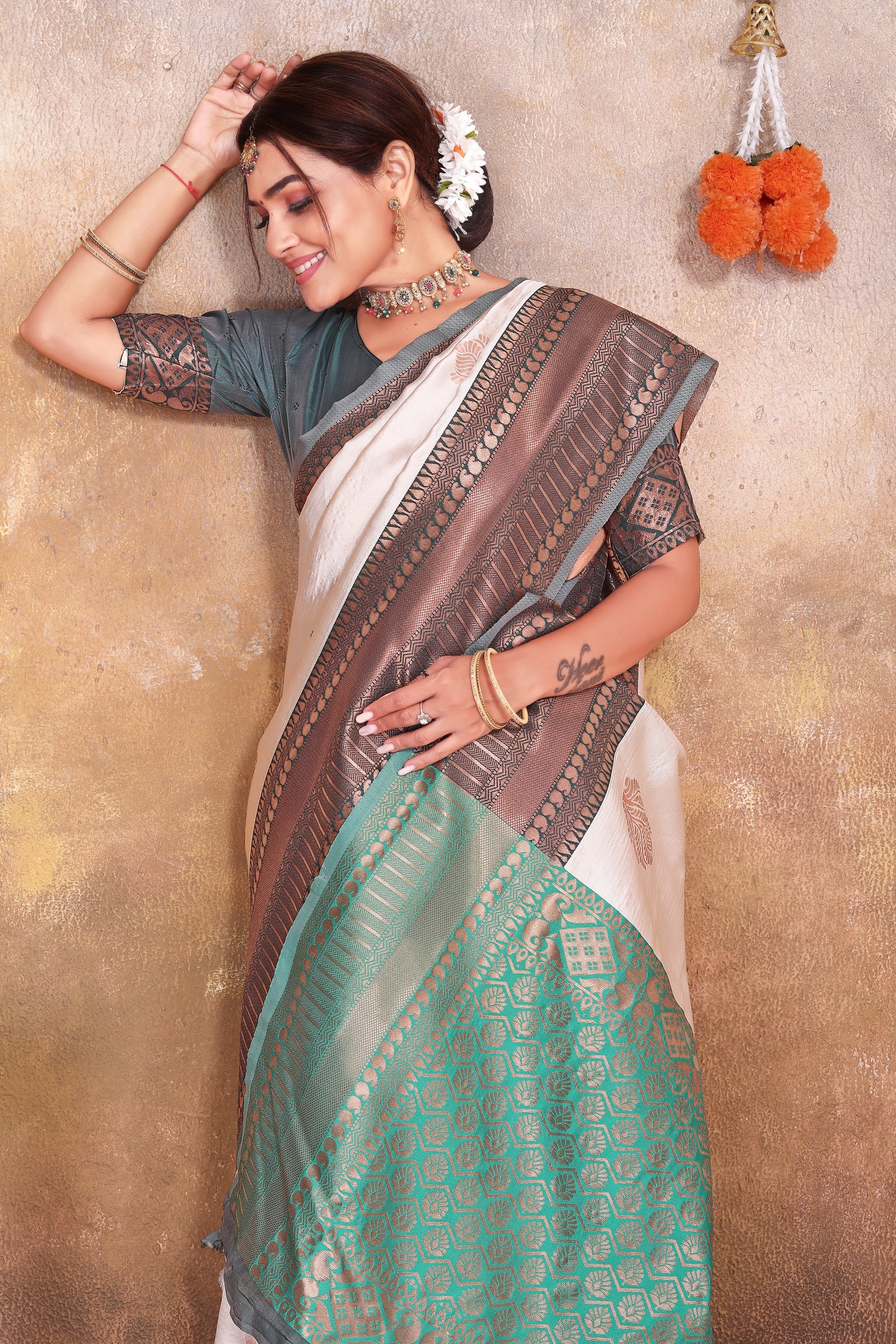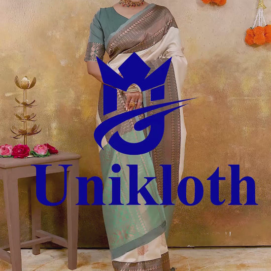 Elevate your ethnic style with this Kanjivaram Silk Saree, featuring a regal combination of cream, green, and brown with intricate zari weaving. Designed for women who love timeless elegance, this saree blends tradition with luxury, ensuring a graceful and stunning look for any grand occasion.