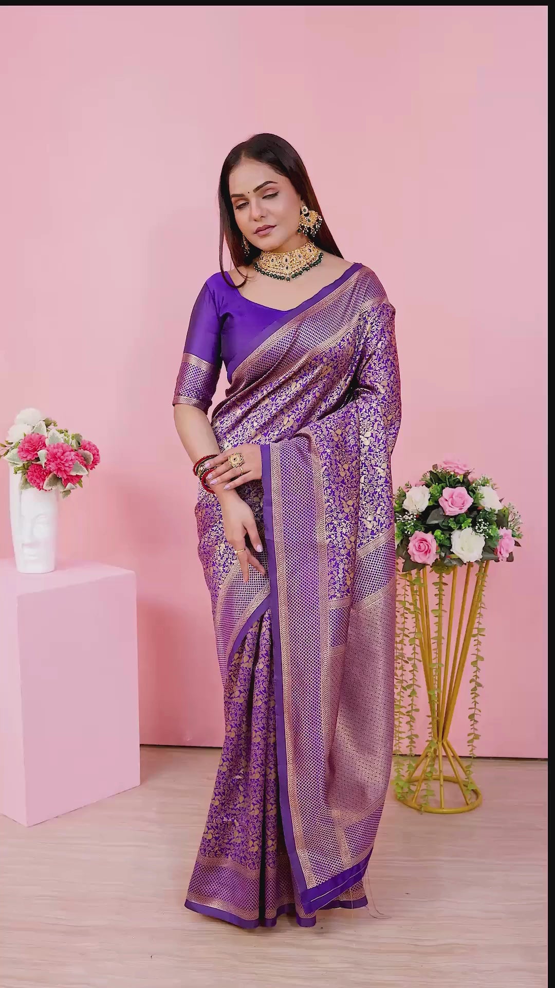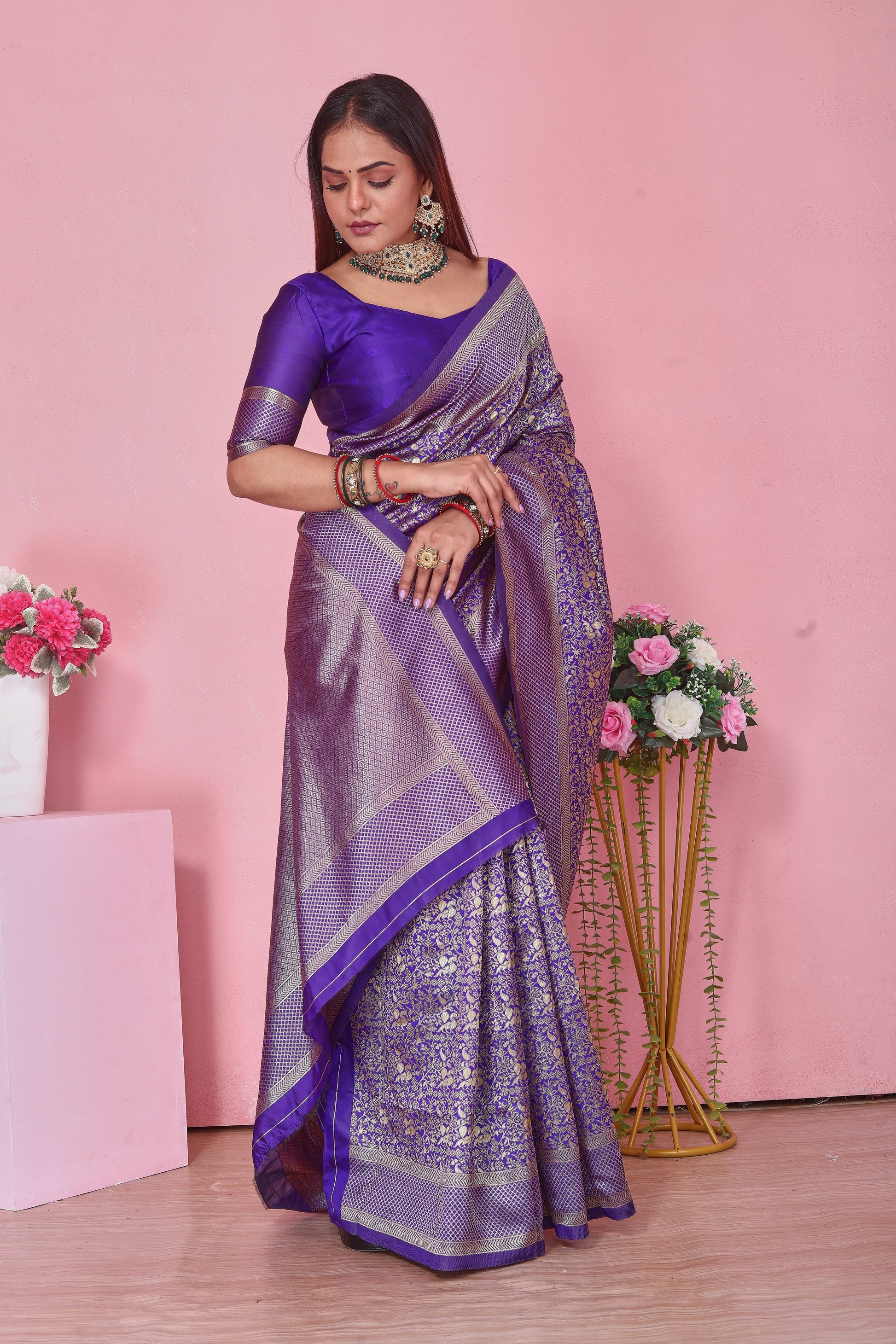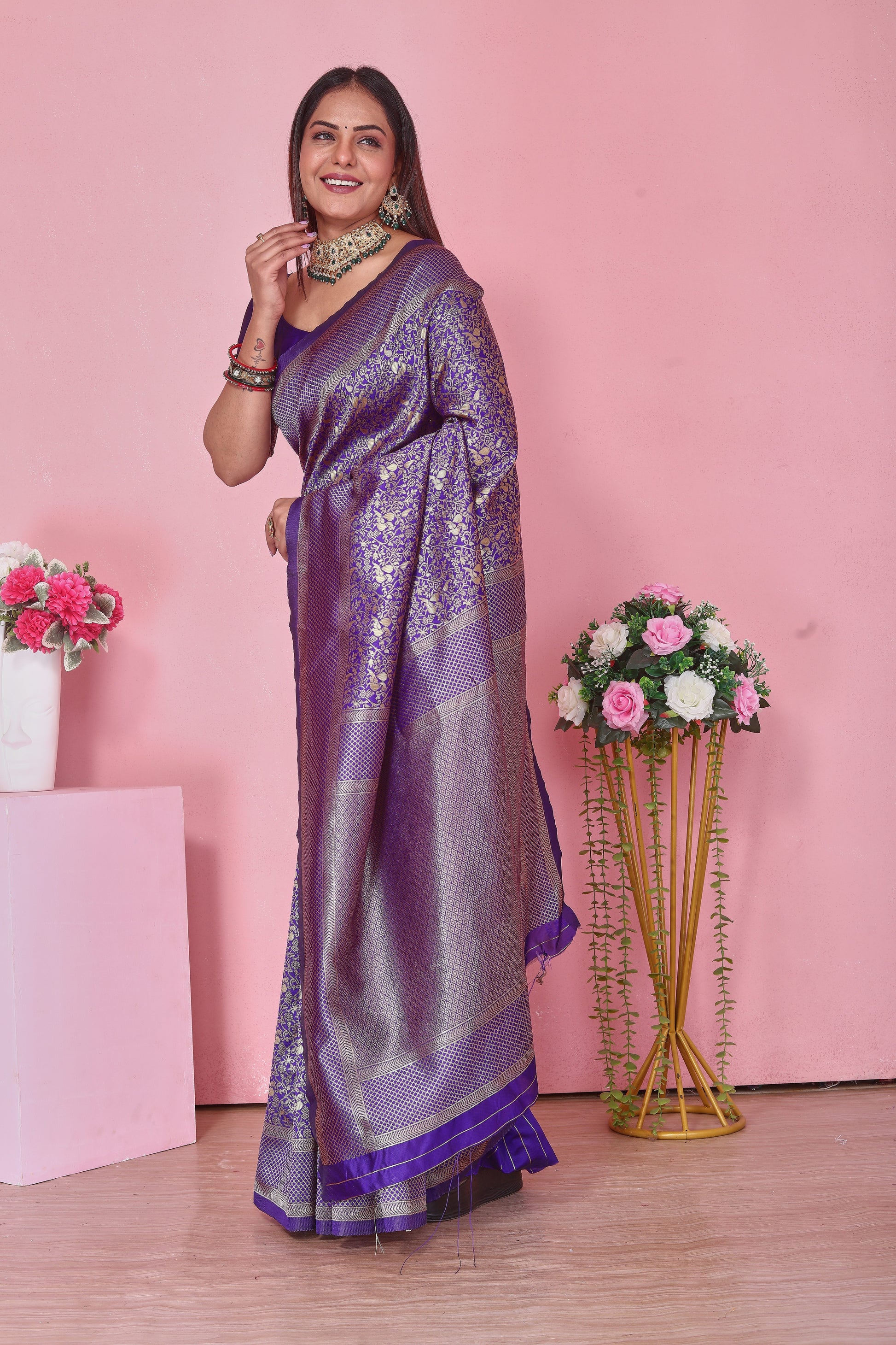 Look stunning in this Royal Purple Banarasi Silk Saree, featuring rich golden floral zari weaving and an intricately designed border. Crafted from premium silk for a luxurious drape, it’s ideal for women who love traditional elegance with a modern touch.