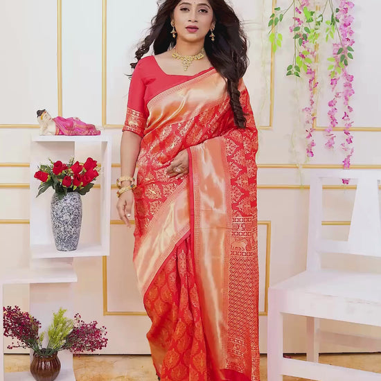 Embrace elegance with this Red Kanjivaram Art Silk Saree, featuring intricate golden zari jaal and a beautifully woven border and pallu. Crafted from a premium silk blend, this saree offers both luxury and comfort, making it an ideal choice for grand occasions.