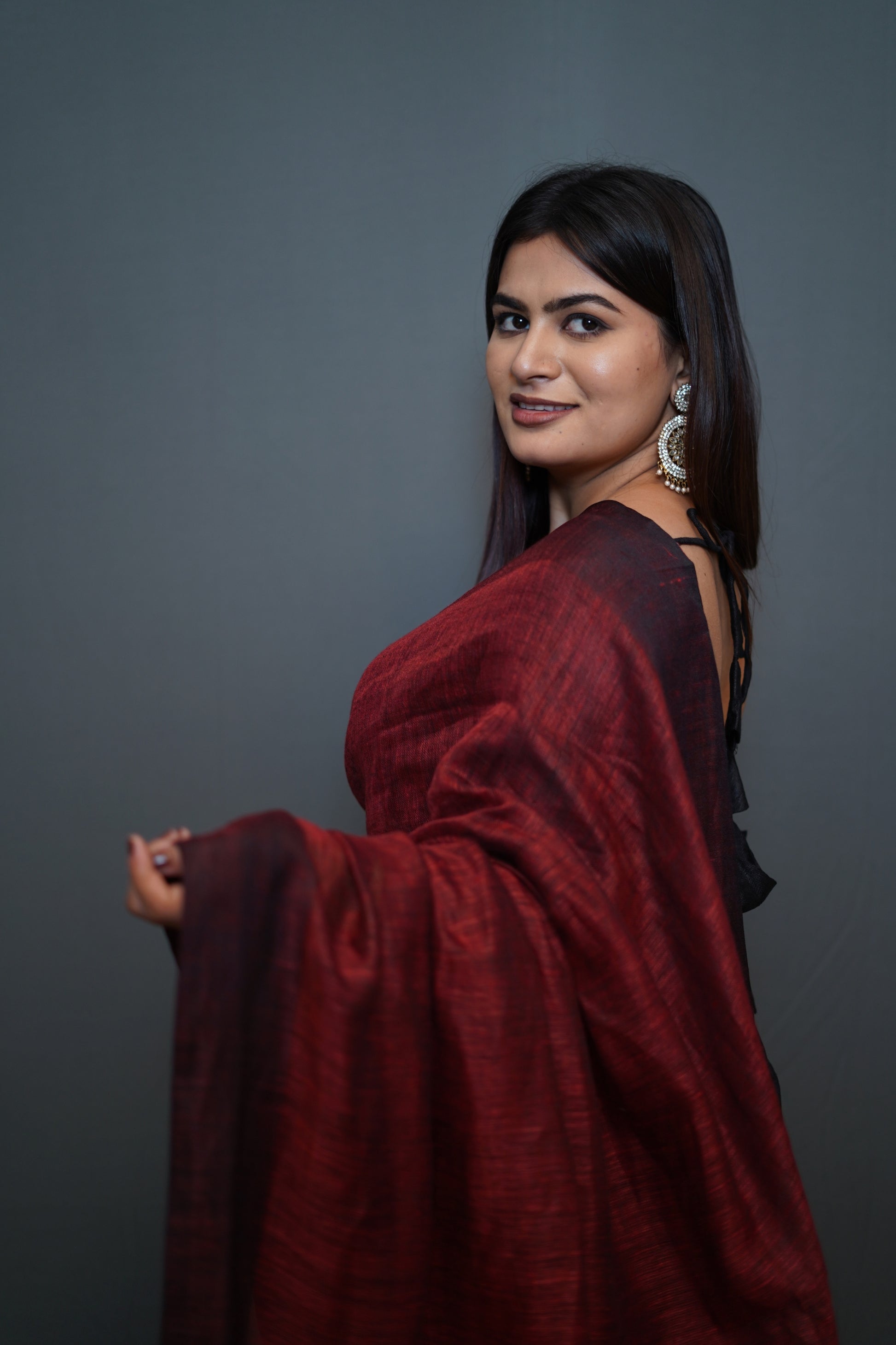 Wine Red Tissue Saree with Golden Border and Black Contrast Pallu